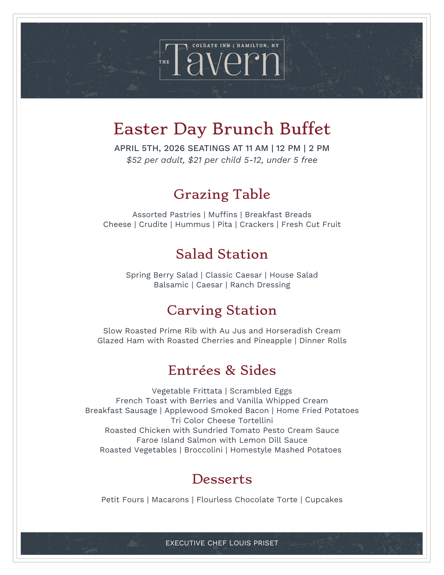 Celebrate Easter with a festive brunch buffet the whole family will enjoy! Join us on Sunday, April 5th for a delicious spread of seasonal favorites and brunch classics. Gather with friends and loved ones and make the holiday special with great food and warm hospitality.