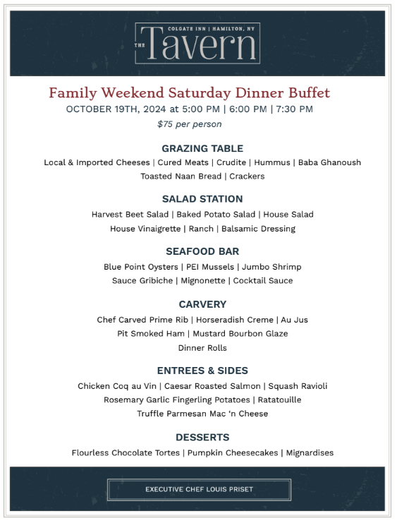 Join us for a Family Weekend Dinner Buffet on Saturday, October 18th with seatings at 5:00pm, 6:00pm and 7:30pm. Dinner is $75/person. Gather your loved ones and enjoy a warm, welcoming atmosphere where great food and good company come together. Call us at 315-824-2300 to reserve your spot today!