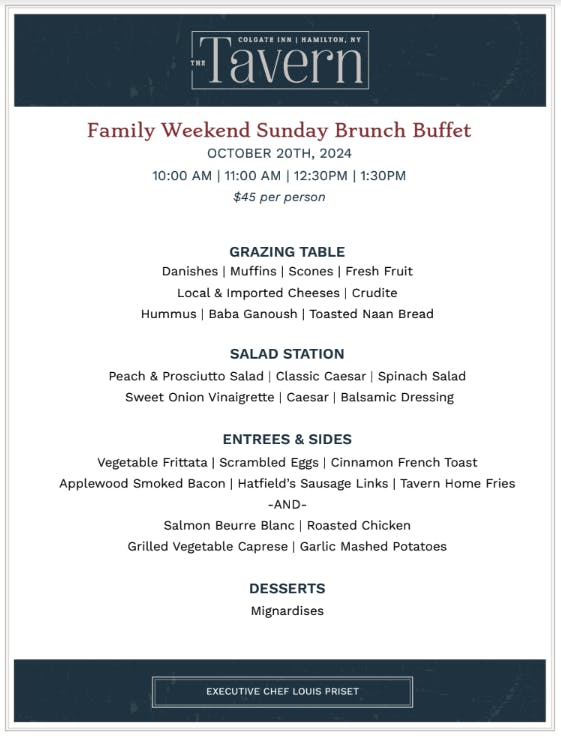 Join us for a Family Weekend Brunch Buffet on Sunday, October 20th with seatings at 10:00am, 11:00am, 12:30pm, 1:30pm. Brunch is $45/person. Gather your loved ones and enjoy a warm, welcoming atmosphere where great food and good company come together. Call us at 315-824-2300 to reserve your spot today!